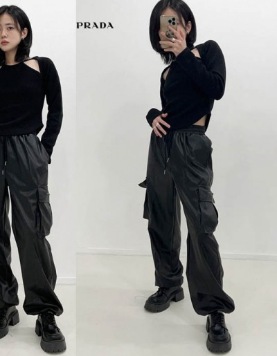 프라다 삼각로고 여성 레더 스트링 와이드 카고 팬츠